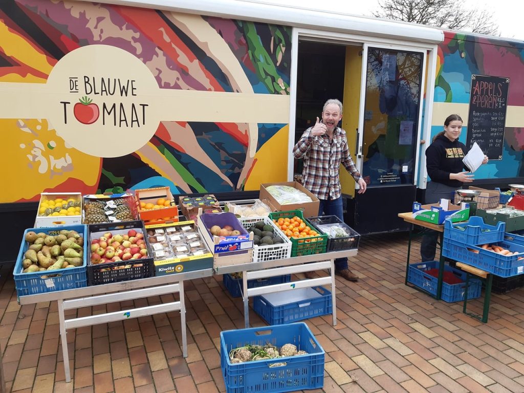 Wat doet De Blauwe Tomaat? Je hebt ‘m vast al door Arnhem zien rijden, de 9 meter lange SRV wagen van De Blauwe Tomaat. Met onze lage prijzen voor groente en fruit zorgen wij ervoor dat ‘iedereen toegang heeft tot gezonde voeding.’