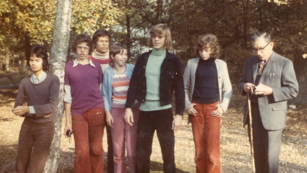 Leerlingen met directeur Frater Ferdinand in het bos.