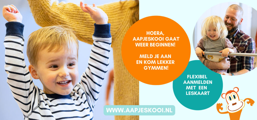 Jippie, deze week starten de Aapjeskooilessen weer op zaterdag in Arnhem Zuid. In onze fantasierijke gymlessen kunnen kinderen van 1,5 t/m 6 jaar oefenen met verschillende bewegingsvaardigheden, spelletjes doen met leeftijdsgenootjes en ontdekken wat ze al kunnen en durven in een zaal vol toestellen.