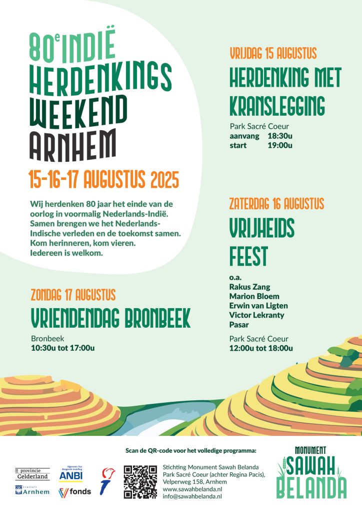 Het bestuur van de stichting monument Sawah Belanda Arnhem organiseert op 15, 16 en 17 augustus een Indië weekend. Op 15 augustus om 19.00 vindt eerst de plechtige 80e herdenking en kranslegging plaats bij het Indisch monument in park Sacré Coeur. Op 16 augustus is het vrijheidsfeest van 12.00 tot 18.00 uur ook in park Sacré Coeur. Op 17 augustus vindt de Vriendendag in Bronbeek plaats. Park Sacré Coeur ligt aan de Velperweg 158 in Arnhem (achter het verzorgingshuis van Regina Pacis).