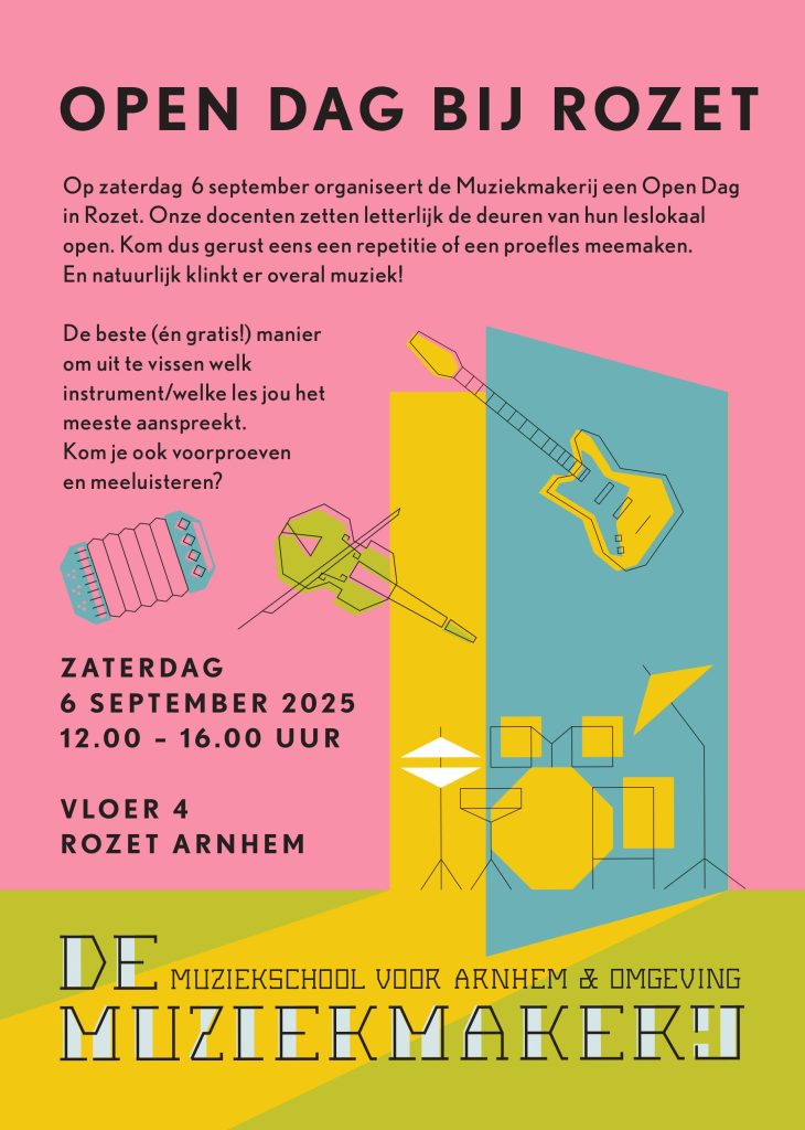 Op zaterdag 6 september organiseert de Muziekmakerij een Open Dag in Rozet. Onze docenten zetten letterlijk de deuren van hun leslokaal open. Kom dus gerust eens een repetitie of een proefles meemaken. En natuurlijk klinkt er overal muziek! De beste (én gratis!) manier om uit te vissen welk instrument/welke les jou het meeste aanspreekt.