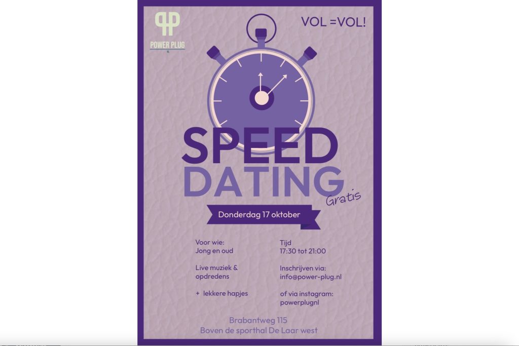 Op donderdag 17 oktober van 17:30 tot 21:00 uur organiseert Power Plug een avond in Motion waarbij jongeren en volwassenen/ouderen uit de wijken De Laar, Elderveld, Elden en Schuytgraaf samen gaan speeddaten! Een gezellige avond met live muziek, lekkere hapjes en vooral veel ontmoetingen.