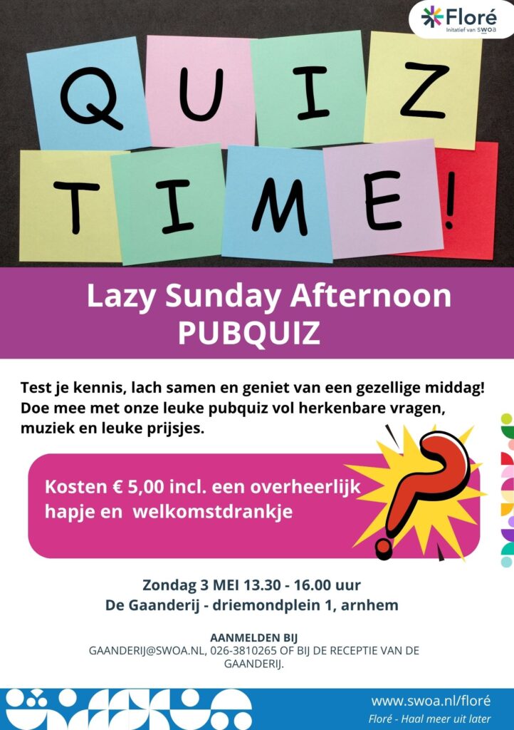 Test je kennis, lach samen en geniet van een gezellige middag tijdens onze Lazy Sunday Afternoon! Doe mee mee met onze leuke pubquiz vol herkenbare vragen, muziek en leuke prijsjes.